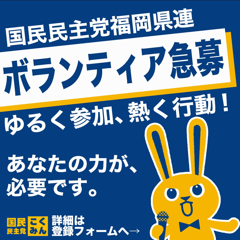 国民民主党福岡県連は、ボランティアを募集いたします。 ご協力賜りますよう、よろしくお願いいたします。 こちらからご登録いただけます。👇 国民民主党福岡県連 選挙ボランティア申し込みフォーム ※ご登録いただけた方には、後日メールにてご連絡差し上げます。 投稿ナビゲーション